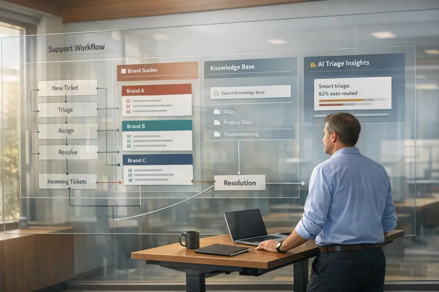 Streamline your support operations through AI with our intelligent platform that combines AI, ticket management, live chat, and deep analytics—all in one place.