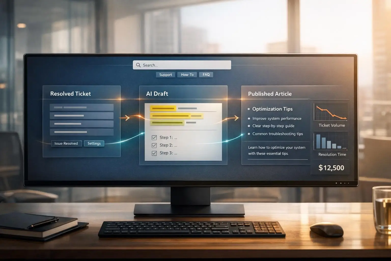 Talk to your AI on how to resolve issues from your knowledge base and create content on the fly from customer tickets with the click of a button.