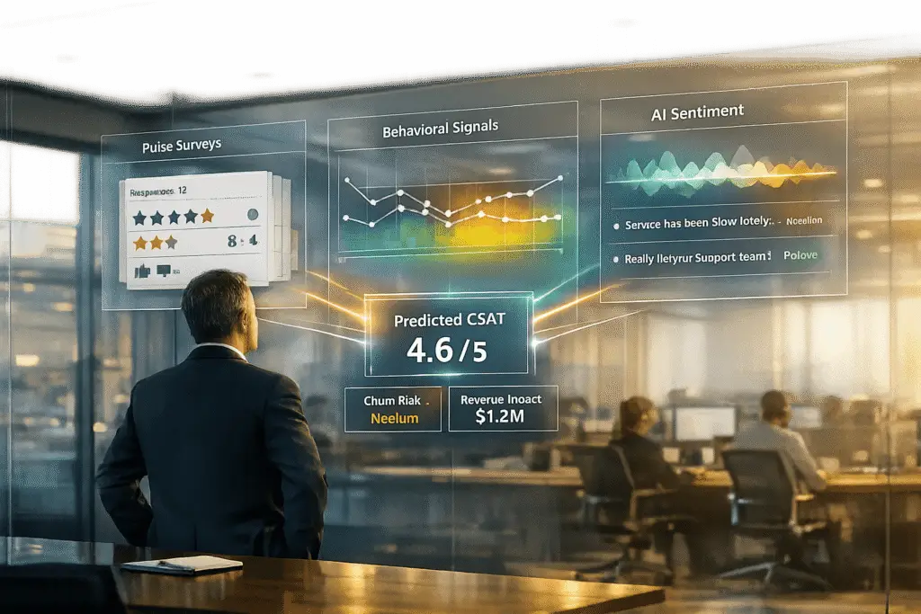 Predictive CSAT models use machine learning to infer customer satisfaction from all conversations, filling in gaps left by traditional surveys [1]. These models analyze signals like sentiment, emotion, intent, and agent behavior to deliver actionable insights [1]. For example, tracking sentiment shifts during a conversation can be particularly revealing – a customer who begins frustrated but ends relieved often represents a more meaningful positive experience than one with a neutral tone throughout [1].