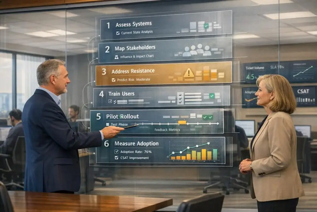 Getting the right people involved from the beginning builds trust and alignment. Form a Change Advisory Board with representatives from support, IT, finance, and customer success. This group can help assess goals and remove structural barriers.