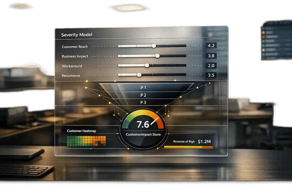 Shift from technical issues (e.g., crashes) to customer outcomes (e.g., blocked workflows or financial risk). For example:- P1 (Critical): Total business blockages or revenue risks.