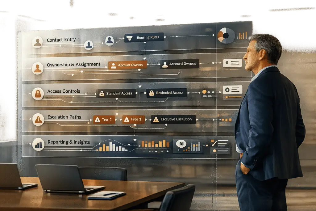 In the fast-changing world of AI-driven support, having a structured contact governance model is key to scaling enterprise operations effectively. This model is built through five essential steps: mapping stakeholders, assigning roles, setting permissions, creating escalation paths, selecting a modern support CRM, and tracking performance. These steps help transition from informal, tribal knowledge to a clear, machine-enforceable system that grows seamlessly as your account base expands [1].