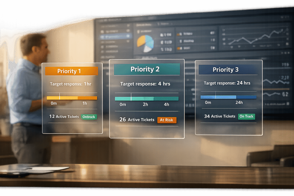 - Priority 1: System outage affecting multiple users, requiring a 15-minute response time and a 4-hour resolution goal.