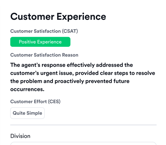 Utilize AI to gain deeper insights into your support tickets, enabling proactive decision-making and enhanced customer experiences. Sentiment analysis and intent detection Predictive CSAT and CES scoring Automated ticket summarization