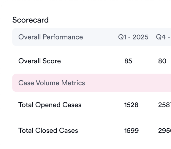 From escalation trends to customer health, visualize everything in one place. KPI dashboards you can customize Scorecards by agent, team, or issue type Full customer journey context Export-ready insights for leadership