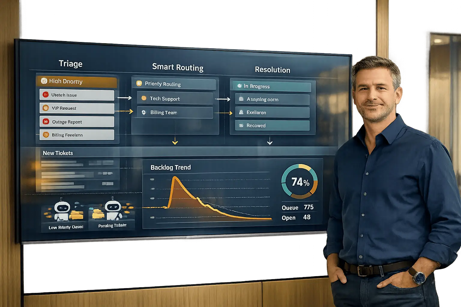 Triage high-impact tickets, speed routing with AI, track leading metrics, and deploy bots to prevent and clear support backlogs.