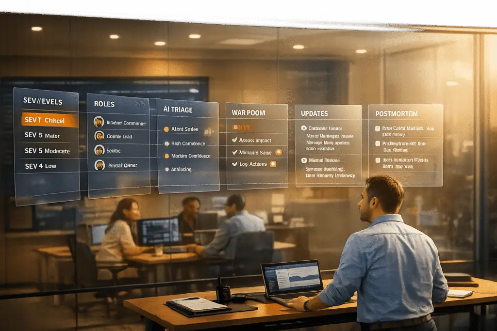 • Establish clear severity levels (SEV1 to SEV5) to prioritize incidents and align teams.