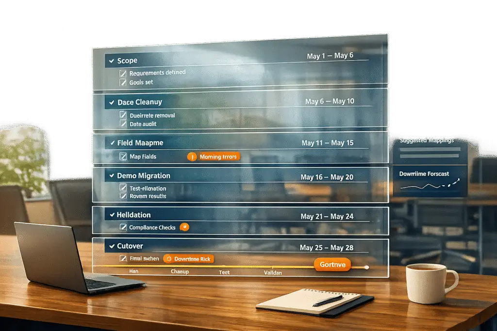 - Plan a timeline: Break the process into phases – preparation, demo migration, execution, and validation.