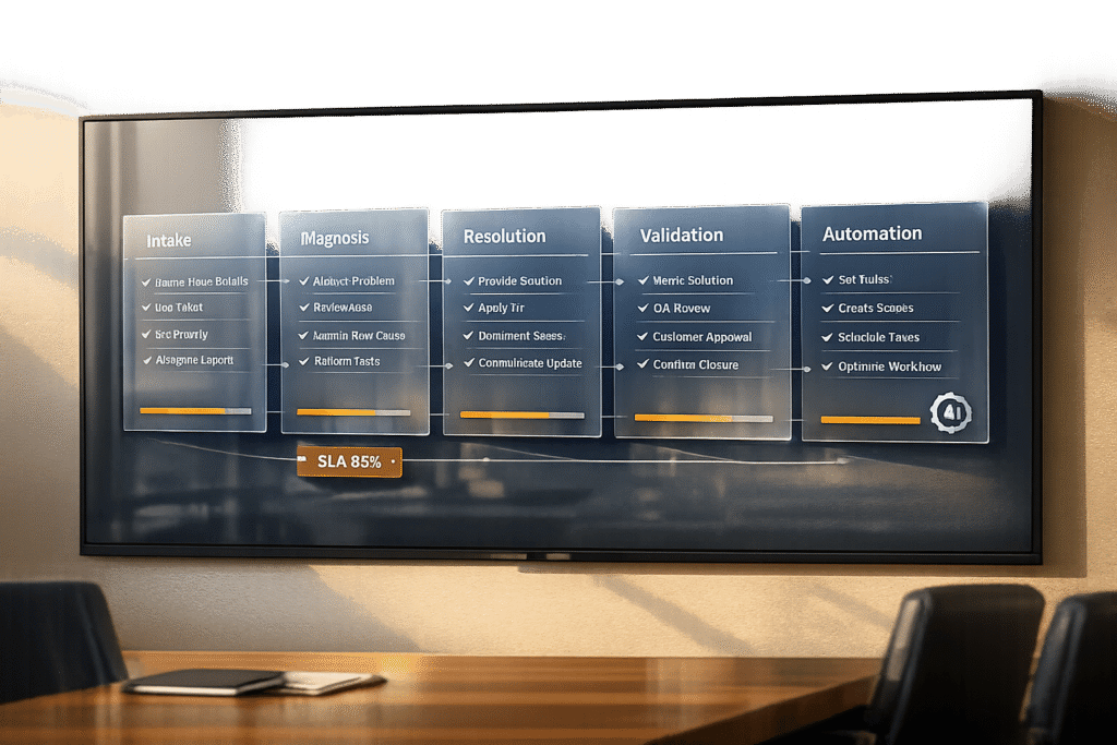 Step-by-Step Resolution Process: Start by verifying the alert on the dashboard. Identify whether the issue stems from internal hardware or vendor software, and then carry out the fix. Each step should include an "Expected Result." For instance, "Within 2 minutes of resetting the sensor array, the dashboard should display ‘Status: Active,’ and throughput should return to at least 115 units/hour." This structured approach aligns with scalable, AI-driven support practices.