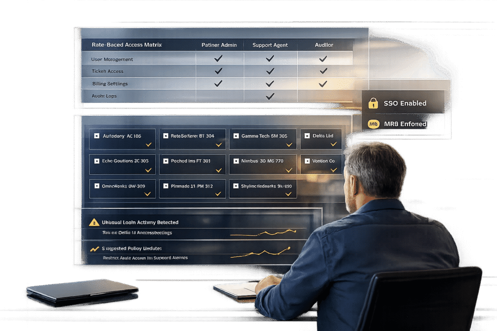 Resellers and MSPs often need tailored access to your customer portal. For instance, a tier-one support technician handling password resets will require different permissions than a security analyst reviewing compliance policies or an escalation manager routing urgent incidents. The challenge lies in aligning access levels with job roles while avoiding security vulnerabilities or operational inefficiencies.