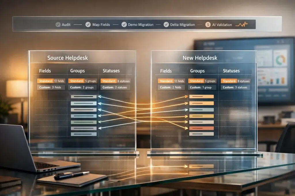 Running multiple demo migrations is a smart way to ensure everything – from custom field values to agent assignments and status transitions – appears correctly in the new system. AI agents can also simulate common user actions like ticket creation, status updates, or escalations to confirm that automated workflows behave as expected. By comparing outputs from the old and new systems, you can catch any discrepancies before they affect live operations.