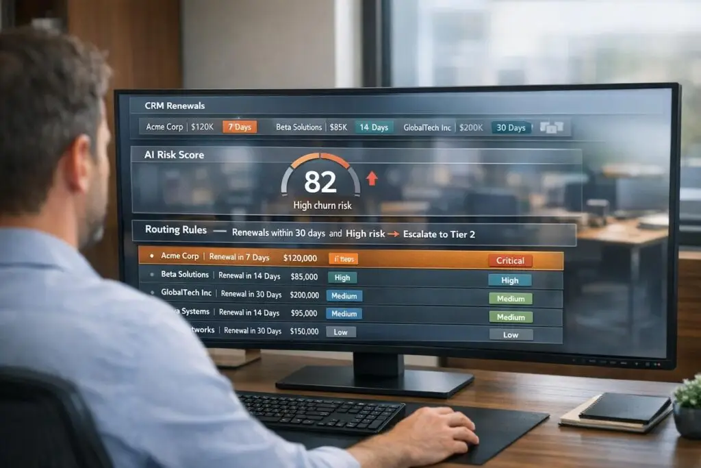 Once AI identifies at-risk accounts, the next step is to tie renewal timelines into priority rules. This ensures that accounts nearing renewal deadlines get the attention they need, especially if they’re flagged as at-risk. By integrating these insights, your team can respond faster and more effectively.