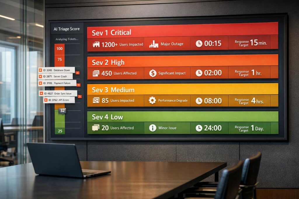 AI simplifies triage by removing much of the mental burden from classification. Using a weighted scoring system, it evaluates dimensions like User Impact, Functionality, Business Risk, Urgency, and Workaround Availability to calculate a severity score in seconds. For example, if a ticket scores between 12 and 15 points, the system can automatically classify it as a SEV1 and route it to the appropriate team.