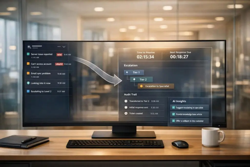 This approach centralizes all case history, customer data, and past interactions in one place. AI tools can then summarize conversations, suggest responses, and flag urgent issues based on sentiment and content analysis. Ownership is clearly defined through assignment rules and queue management, eliminating confusion over responsibilities. Structured workflows ensure escalations are handled efficiently, bringing in engineering or other teams only when necessary and with all relevant context.