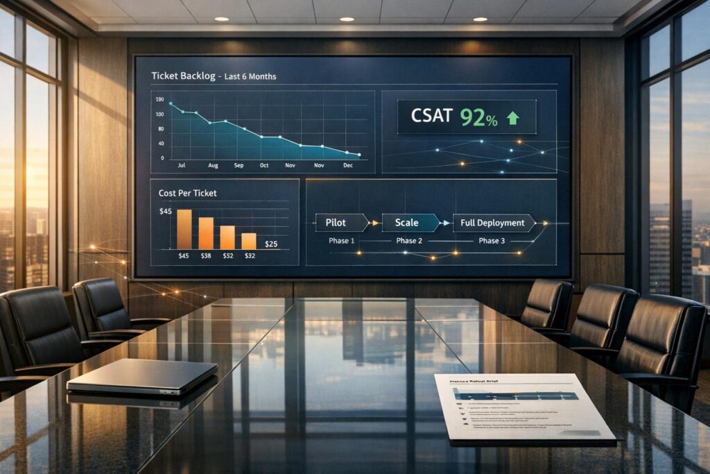 - Align with executive priorities: Focus on hard savings (e.g., reduced costs per ticket) and capacity gains (e.g., handling more tickets without additional hires).