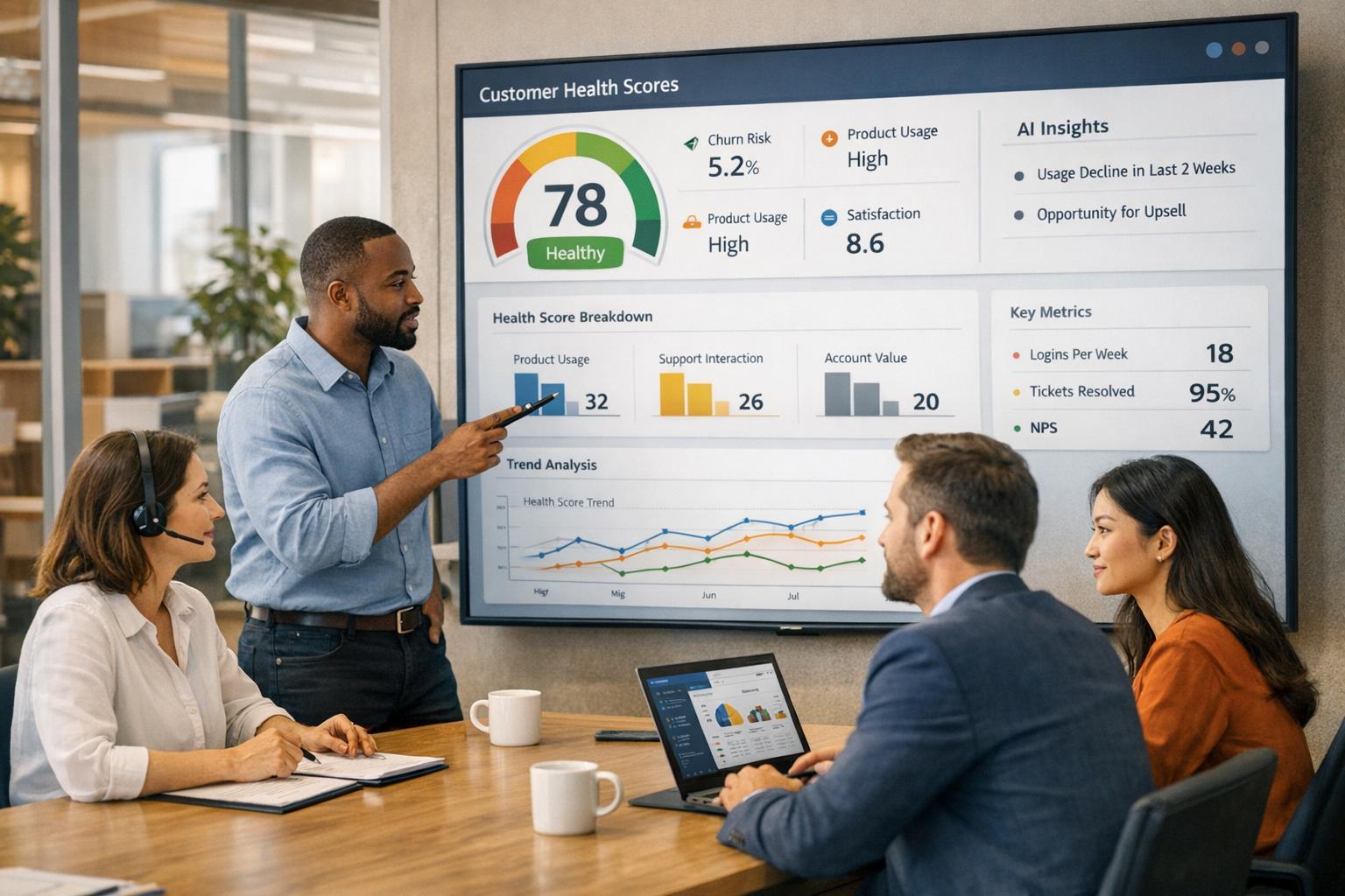 Track AI-enhanced KPIs—FCR, resolution velocity, predictive CSAT, health scores and cost-per-case—to measure efficiency, experience and revenue risk.