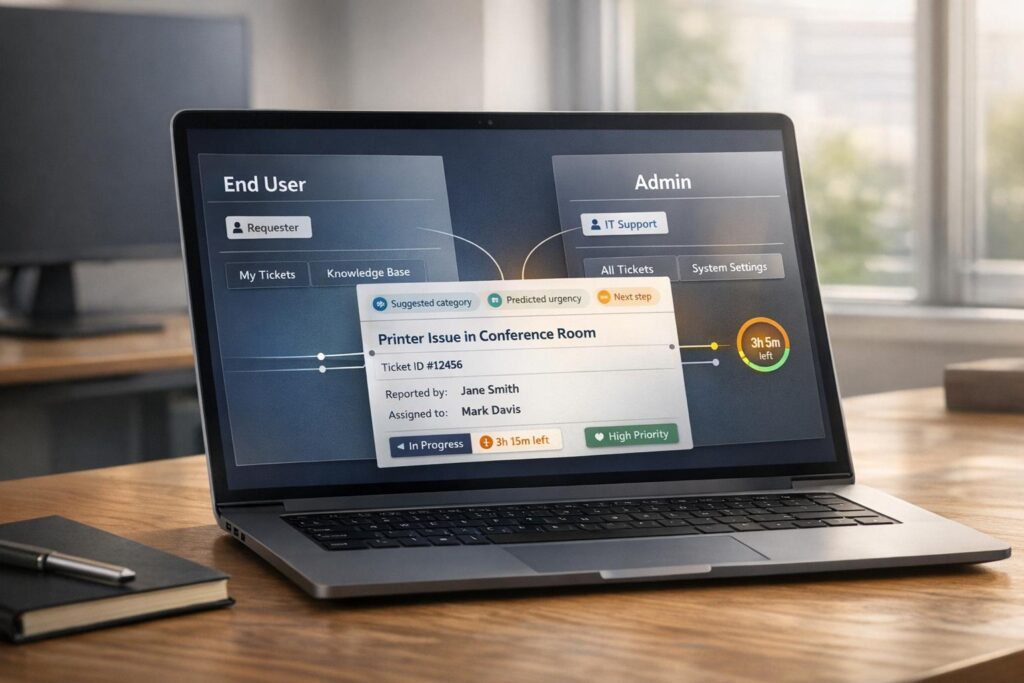 AI automation removes much of the manual effort involved in handling dual workflows. From the moment a ticket is submitted, AI identifies its purpose, assigns a priority, and routes it to the right team. Whether it’s guiding an end-user to AI-driven self-service tools or escalating a security alert from an admin to senior engineers, this process reduces delays and helps meet SLA commitments.