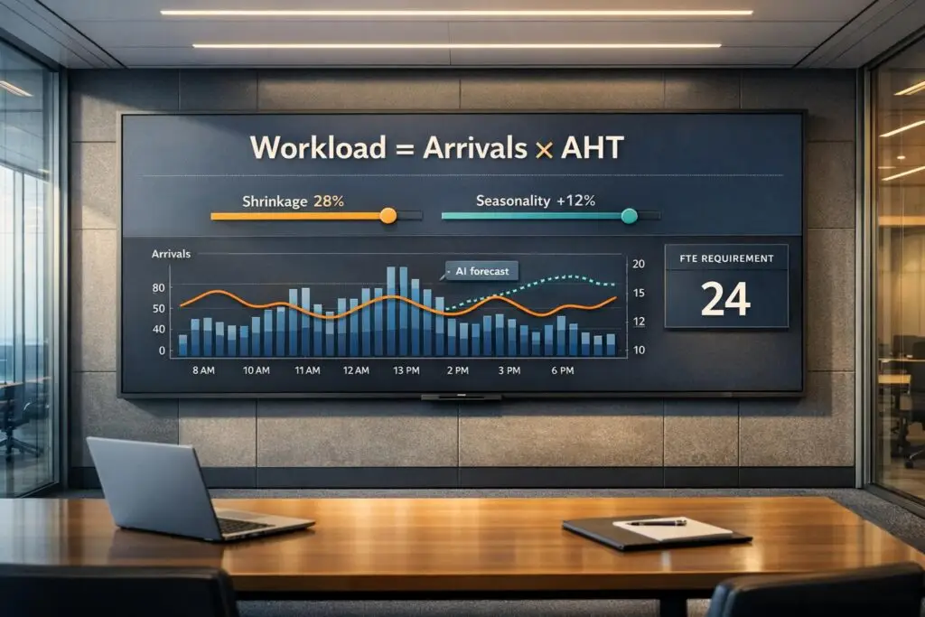 - Staffing Needs (FTEs) = Workload ÷ Agent Hours (adjusted for shrinkage)