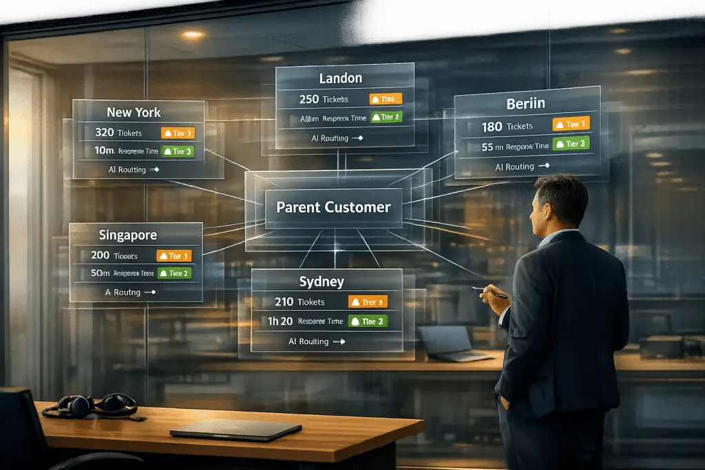 Supporting multiple subsidiaries or locations doesn’t have to be a logistical headache. The secret lies in centralization, standardization, and AI-powered automation – a trio that can transform scattered operations into a streamlined, cost-effective system. By consolidating customer data, workflows, and knowledge into a single platform, organizations can eliminate communication gaps and cut down manual ticket triage by as much as 80%.