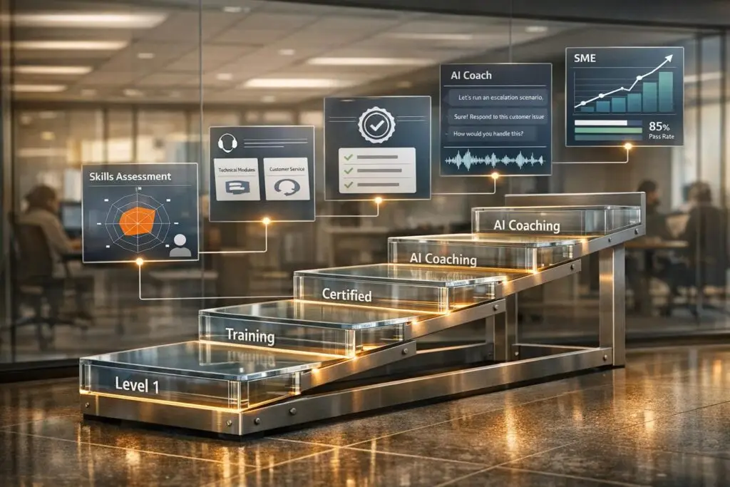 Once you’ve outlined the skills and requirements for each role, the next step is to create training paths that guide agents from basic proficiency to advanced, tier-specific expertise.