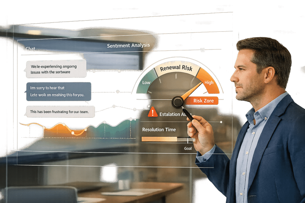 • AI’s Role: Tracks sentiment, usage patterns, and escalation trends to identify risks early.