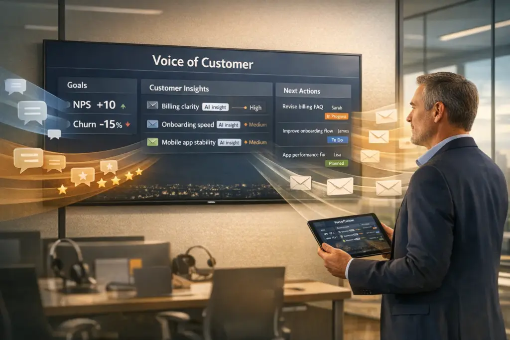 AI-powered Voice of the Customer (VoC) programs do more than just listen – they predict future outcomes. By monitoring signals like declining usage, negative sentiment, or rising ticket volumes, AI can forecast churn risks and revenue threats before they’re reflected in traditional surveys. This shifts VoC from a reactive process to a proactive one.